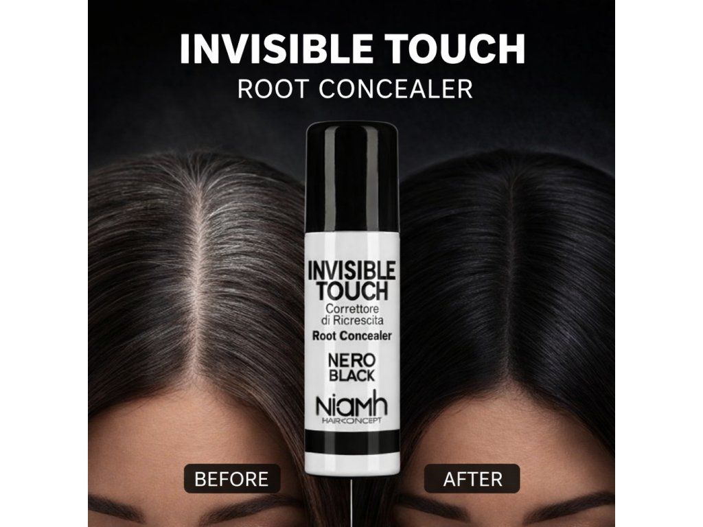 Invisible Touch Root Concealer Black rychle kryje šedivé odrosty a sjednocuje barvu vlasů. Praktický sprej zasychá během chvíle a zanechává přirozený barevný efekt.