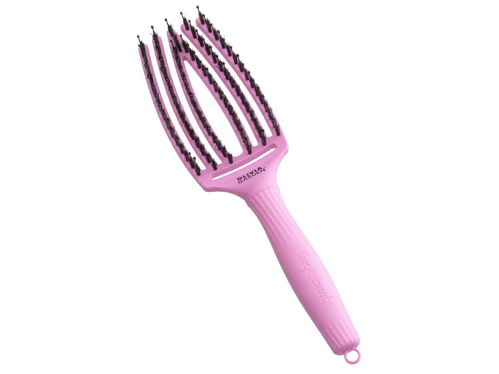 Kartáč Olivia Garden Fingerbrush Combo Medium má speciálně tvarovaný design, který je vhodný k masáži vlasové pokožky. Můžete jej použít jak na mokré, tak suché vlasy. Obsahuje směs čistých kančích štětin, jejich úkolem je vyhladit vlasové vlákno během stylingu a vlasům dodat potřebný lesk, objem a nylonové štětiny, které pokožku jemně stimulují. Extra jemné, anti-statické štětiny zajišťují obzvláště jemnou péči pro vaše vlasy a zabraňují elektrostatickému nabíjení vlasů. Velké vzduchové díry kartáčů poskytují lepší proudění vzduchu. Výsledkem je rychlejší a efektivnější sušení. Ergonomická rukojeť z protiskluzového materiálu a vyjímatelný hrot pro oddělování pramenů zajišťuje maximální pohodlí.